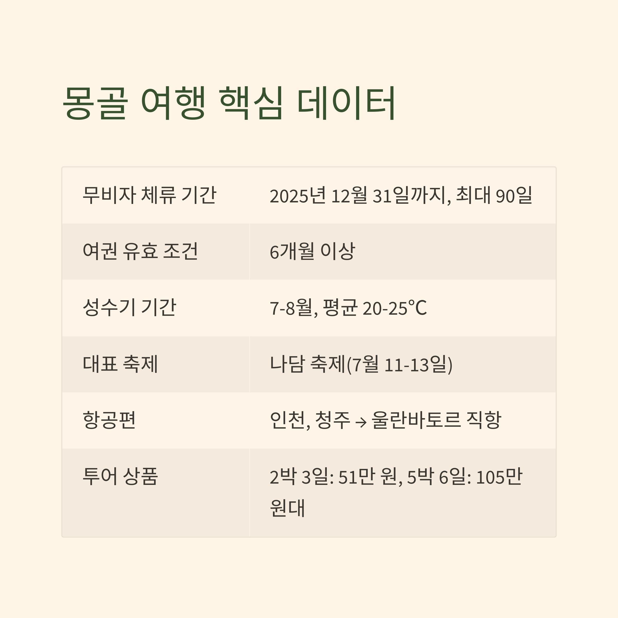 2025년에도 한국인은 최대 90일간 몽골을 무비자로 여행할 수 있으며, 7~8월 여름 성수기에는 자연 경관과 전통 축제를 모두 경험할 수 있는 최적기입니다. 본문에서는 무비자 입국 조건, 비자 발급 예외, 성수기 일정과 명소, 여행 준비사항까지 모두 정리해드립니다.
