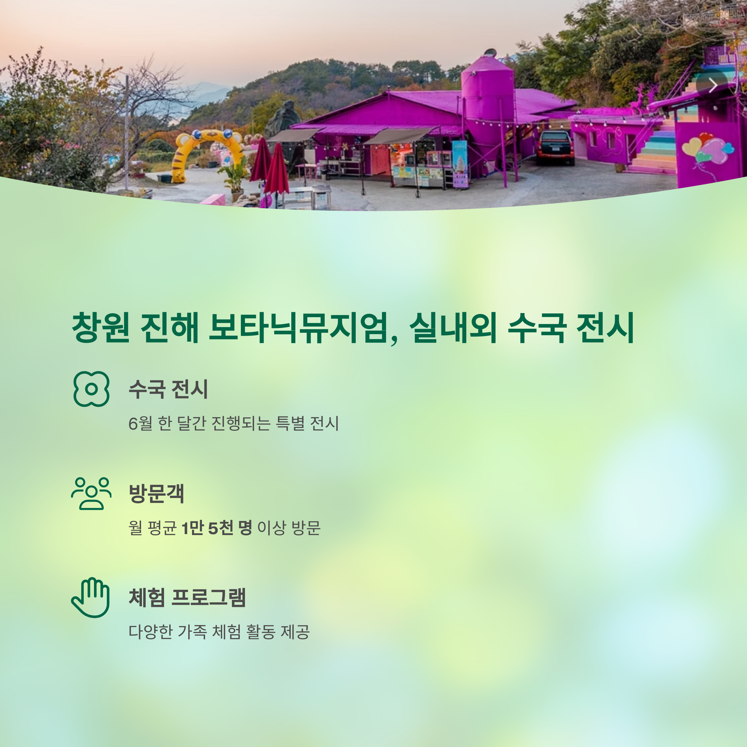 | 창원 | 보타닉뮤지엄 | 수국전시, 체험 | 유료 / 상시 | 1.5만 명/월 |